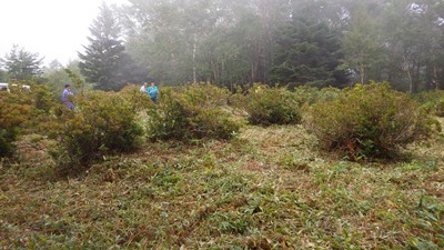 さて、五味池破風高原では、レンゲツツジが単木状になるように、周囲の植物(主にササ)を刈払う作業が行われています。