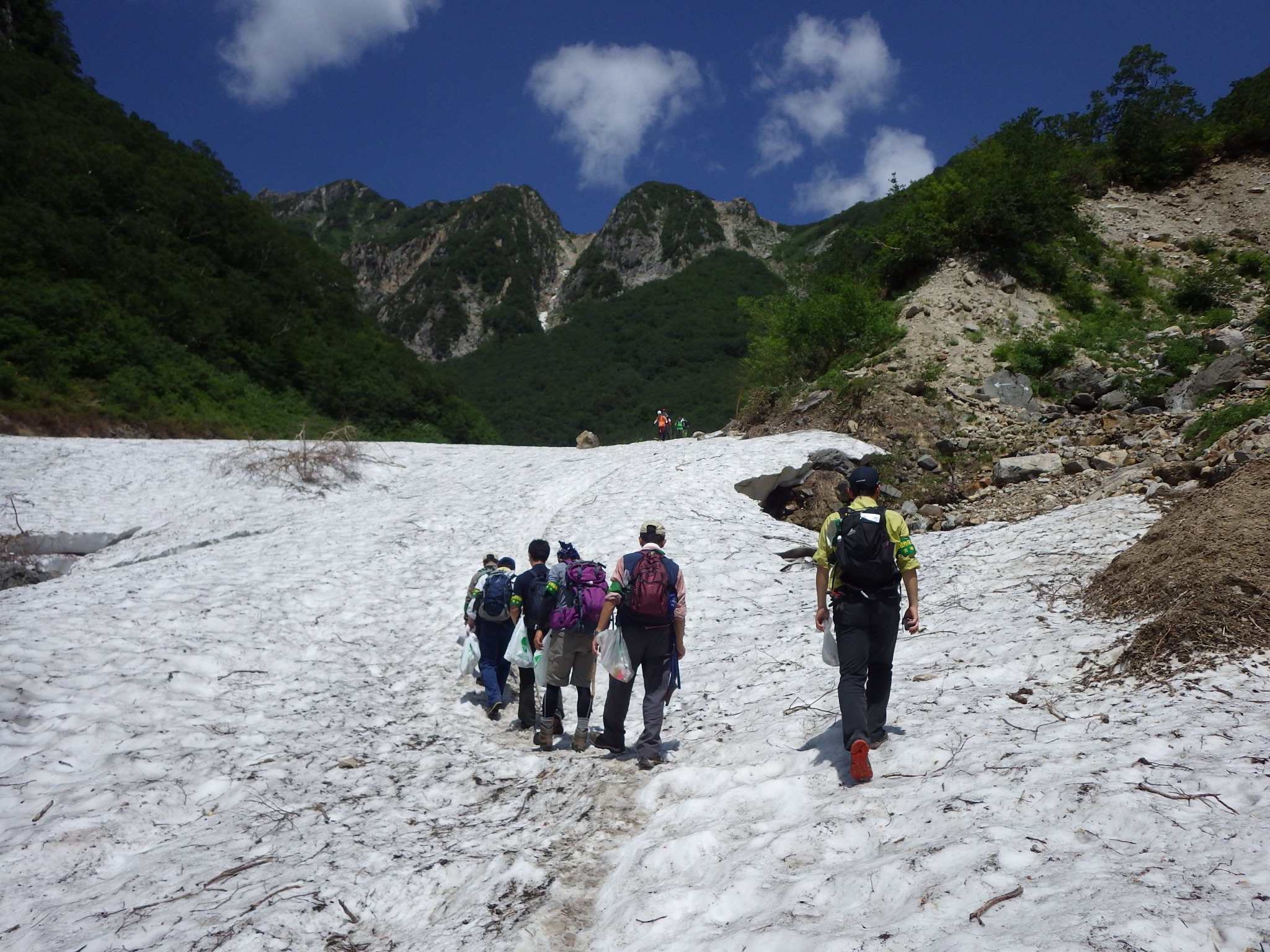 上高地では毎年、涸沢と槍沢に別れて、林野庁、長野県、松本市、環境省などのメンバーで実施しています。