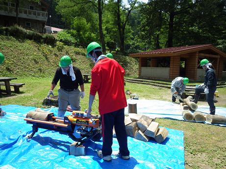 観察会終了後、薪割り体験を行いました。薪割り機の操作はとても簡単でレバーを引くだけです。力はまったくいりません。薪がパキン!ときれいに割れました。