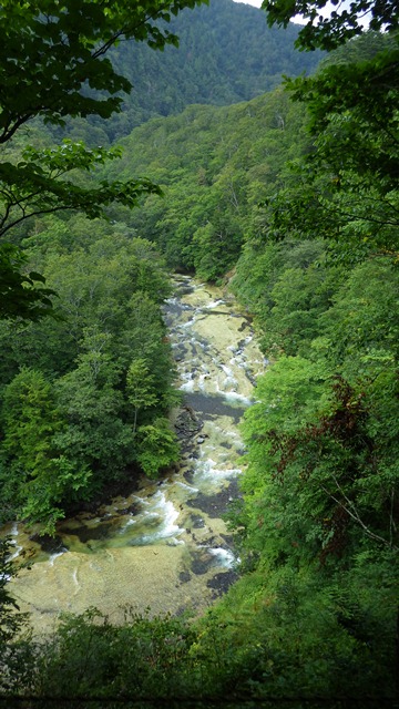 奥志賀渓谷の見どころの一つは渓谷の景色です。「グリーンタフ」と呼ばれる緑色凝灰岩の岩盤の上を川が流れます。このグリーンタフは一枚の岩盤だそうです。
