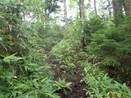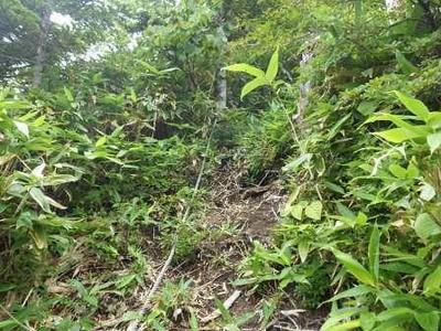 赤倉山山頂。山頂手前に赤湯に下る分岐もあります。ここに来るまでも途中ササ深い所が何カ所かありましたが、ここから先が本格的な藪漕ぎの道でした。