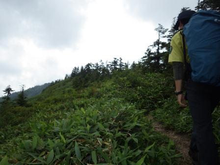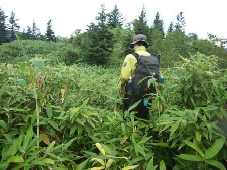 背の高さを超えたササが茂り、前の人がよく見えません。一応、ここも道です。