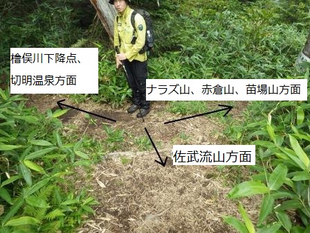 西赤沢源頭分岐。下山時は佐武流山山頂からこの分岐へ戻り、切明温泉方面へ進みました。