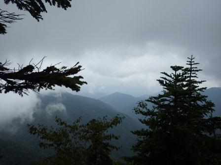 森を抜けると新潟県側(写真左)が開けていて、展望がよいです。長野県側(写真右)に天狗の庭という湿地があるようですが、森で見えません。