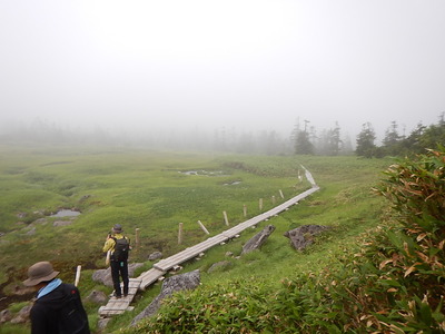 苗場山山頂付近は平坦な湿原が広がり、しばらく木道を進みます。