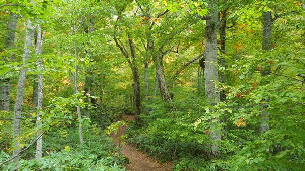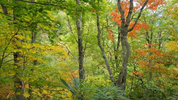 <奥志賀渓谷では、上の写真のように色づいているものがありますが、ブナやミズナラなど多くの木はまだ色づいていませんでした。これらの木々が色づくと、どんな景色になるのでしょう。>