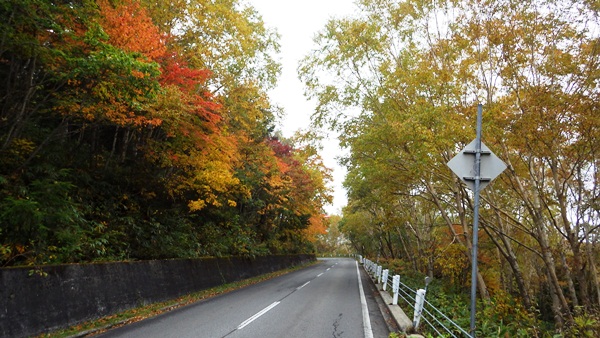 <信州大学自然教育園付近(海抜約1,570m)。国道292号線沿いの林の色づき具合。曇り空だったので暗めに写っています。>
