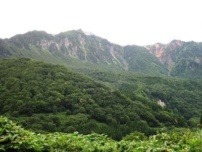 <苗場山山頂部(左)から佐武流山(中央右)にかけての稜線と鳥甲山の北東向き斜面の一部(右)>