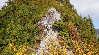 <鳥甲山の岩壁を上ノ原付近から望む。山頂は稜線の奥にあるので見えない。左側のピークが「白くらの頭」、右側のピークが「赤くらの頭」。岩の色は左側が白く、右側が赤いのでそのような名が付いたのかもしれません。なお、「くら」の漢字は「やまかんむり」に品です。>