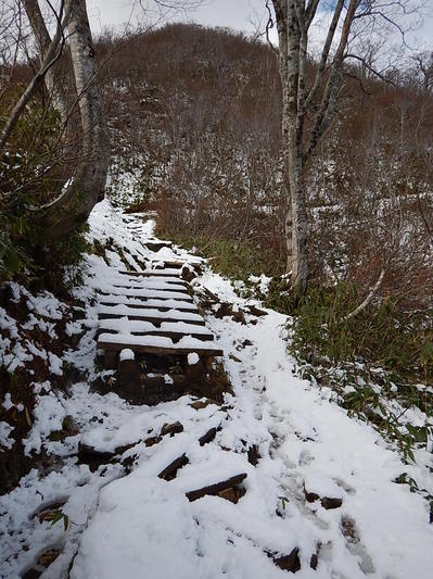 ↑11/27の天神尾根の様子。5~10cm位の積雪でした。周りの木々は落葉し、葉が生い茂っている頃とは景色がかなり違って見えました。