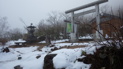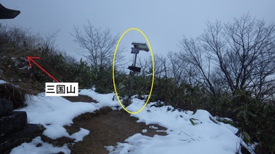 ↑三国峠の登山者カウンターは権現の灯籠の傍に設置していました。この先を登ると三国山に着きます。吹雪いてはいませんでしたが、風がとても寒かったです。