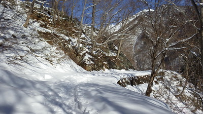 舗装路から湯檜曾川沿いにかけて30~50cm位の積雪で、深いところでは1mを越えており、足が膝の上まで雪に埋まる所も多くありました。