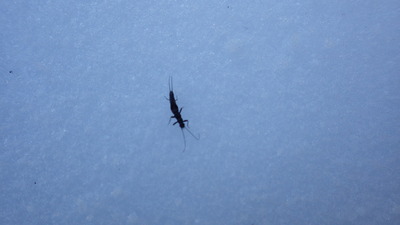 ↑沢の近くの雪の上を活発に動き回る虫を見つけました。調べてみると、名前はセッケイカワゲラといい、「雪虫」とも言われています。多くの生き物が活発になる春~秋は川底で休眠し、逆に多くの生き物が寝静まる冬になると川から地上に出てくるそうです。そんなセッケイカワゲラの、人間で言う「昼夜逆転の生活」ならぬ「夏冬逆転の生態」には、生物多様性を感じさせられました。