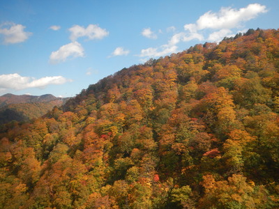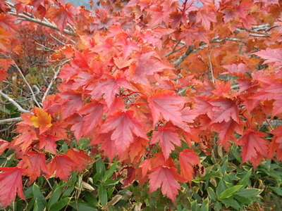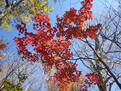 10月の山は紅葉のピークで、平日も多くの利用者が訪れ、山が一番利用者で賑わった月であったような気がします。紅葉というと、真っ赤なカエデの葉が代表的ですが、樺の木やナラ、カラマツなど、ほかの木の葉の黄色やオレンジの美しさにも気付けました。また、紅葉の写真は、少しでも雲がかかると暗くなってきれいに映らないので、写真で伝えるのがなかなか難しいなと思いました。やはり、紅葉は本物を目で見てもらうのが一番ですね。