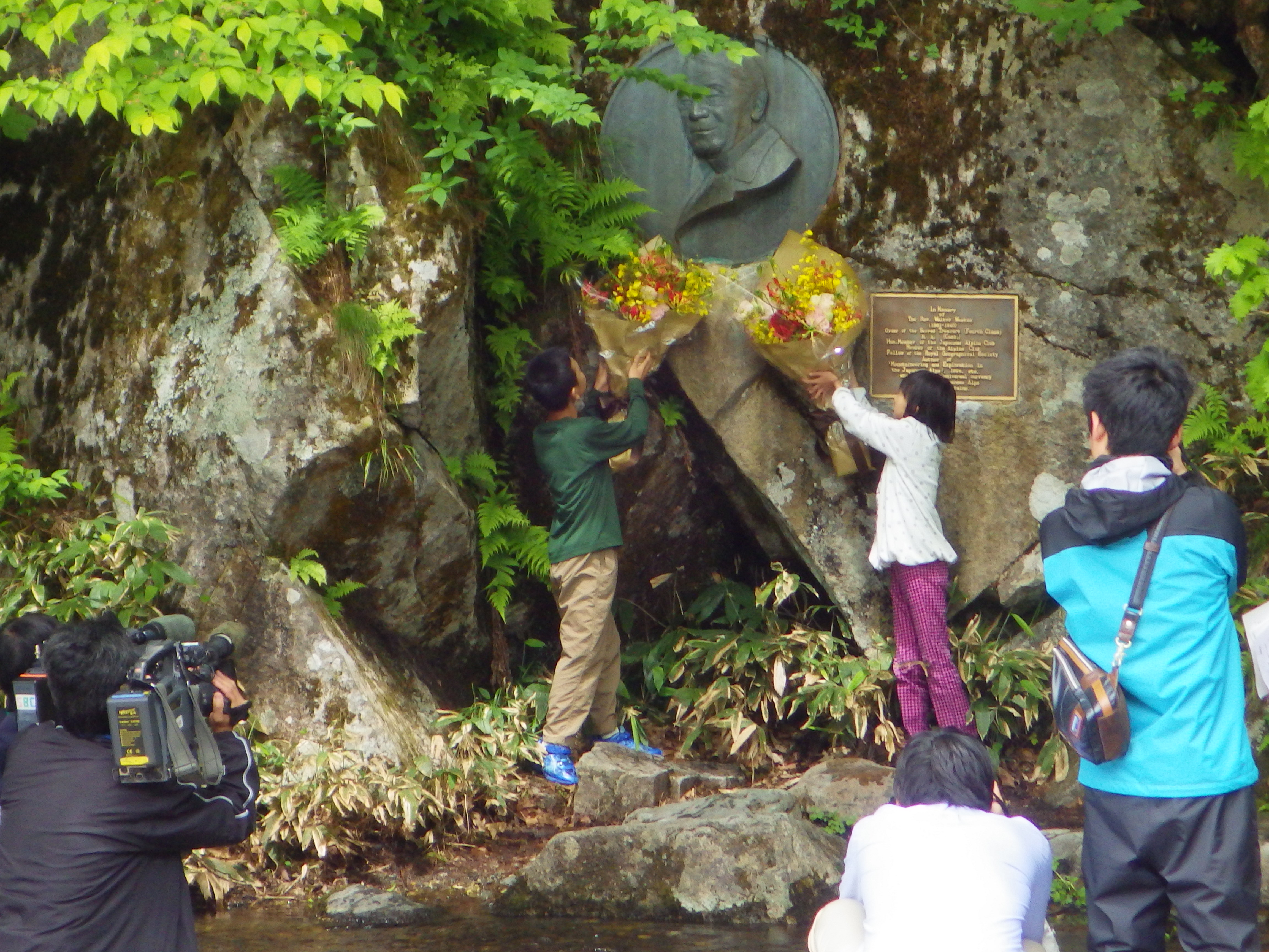 【安曇小4年生の児童からの献花】翌日のウェストン祭ではウェストン碑に花が手向けられました。