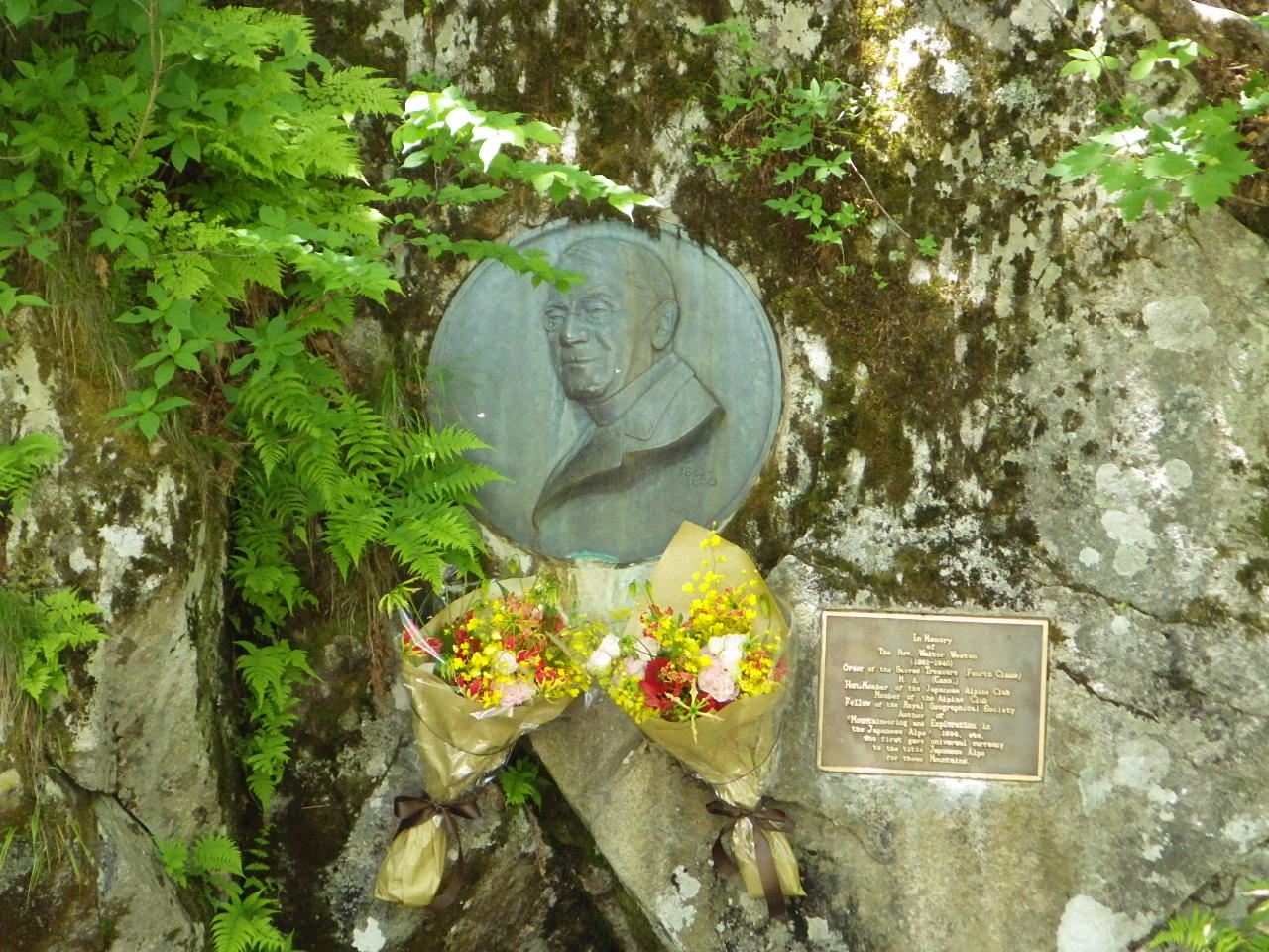 【花を手向けられたウェストン碑】花を手向けられたウェストンさんは心なしか笑顔に見えますね。