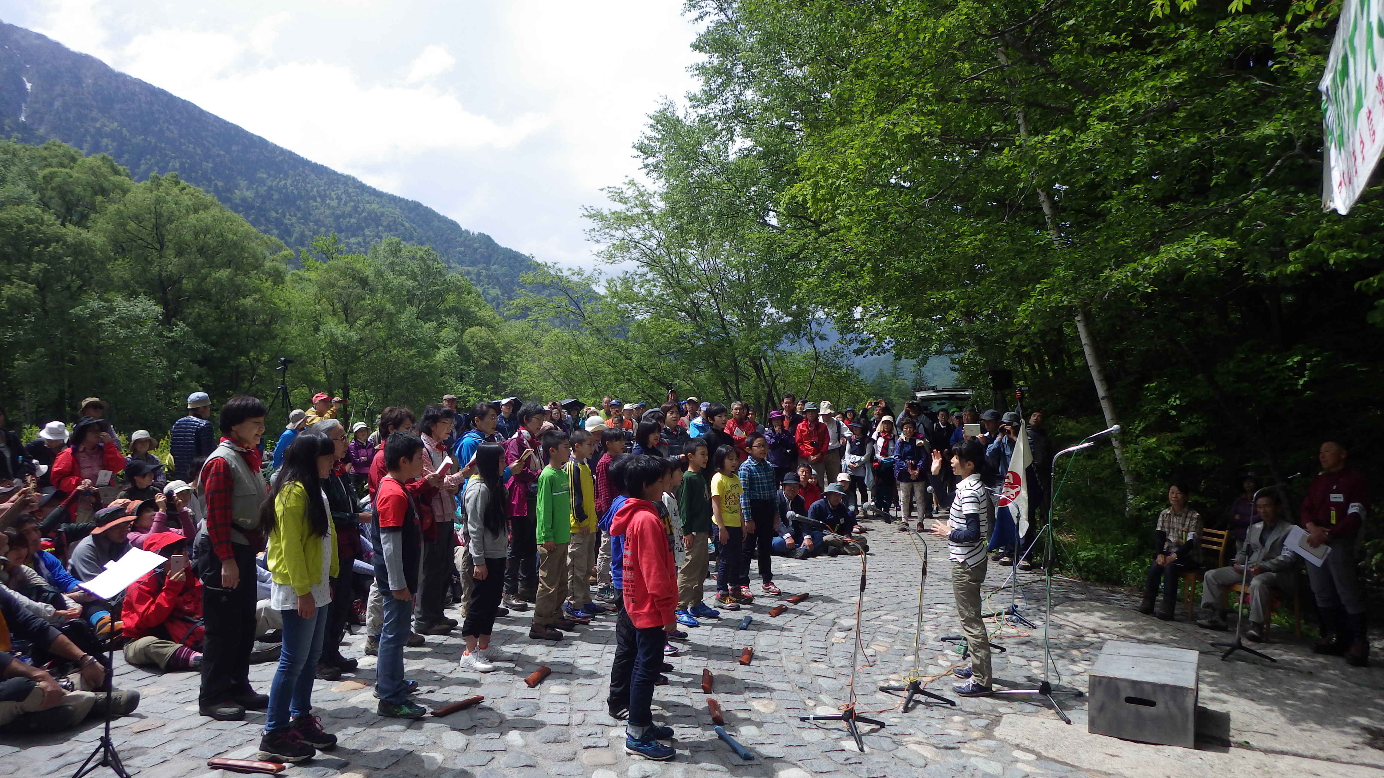 ウェストン祭の前日6月4日には、記念山行があり、その昔ウェストンさんが歩いた道と同じ道を辿って上高地まで歩きました。山岳会の方々はもちろん、地域の方々や、地元安曇小学校の子どもたち、一般の方々、多くの人が参加しました。