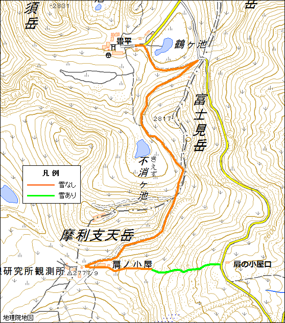 次に肩ノ小屋から畳平までですが、地図上のオレンジ線(車道)も富士見岳を