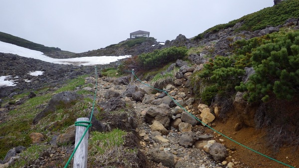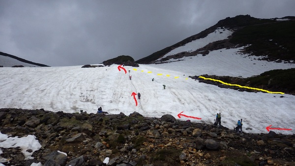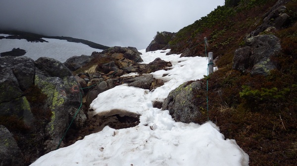 雪渓の直登が終わるとグリーンロープが張られた夏道が確認されますが、