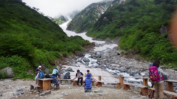 <平成27年7月28日撮影。撮影日は約1ヶ月遅いが、雪渓の下流端は上の写真よりも下流側にあります(雪がたくさん残っている)。人が写っている後にも残雪の塊があります。昨年は残雪が多かったので、これが平年というわけではありませんが、残雪の量の違いが実感できます。>