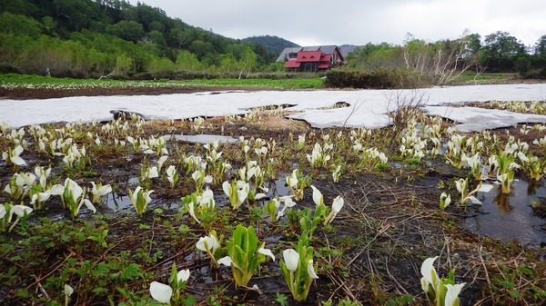 <平成27年7月2日撮影。撮影日は約1ヶ月遅いが、ミズバショウは見頃でした。残雪もありました。>