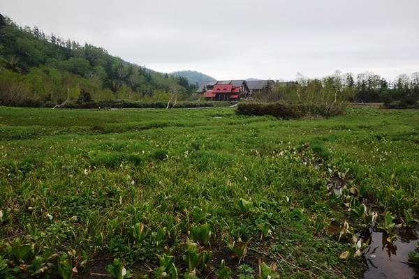 <平成28年6月7日撮影。この場所のミズバショウは既に開花の見頃を過ぎていました。遅霜にやられて仏炎苞(白い部分)が茶変しているものがありました。>