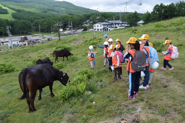 そうそう、作業を終えた帰りには牛の歓迎を受けました。この牛たち、観光のために夏の期間湯の丸高原で放牧されていますが、レンゲツツジ群落の保全にとっても心強い存在です。