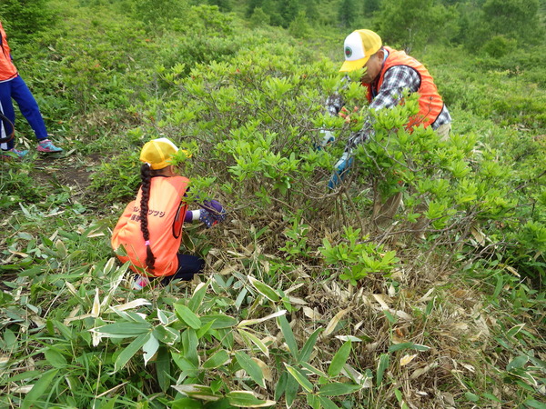 そんなレンゲツツジですが、環境の変化により数が少なくなってしまっているそう・・・。周辺樹木やササの成長により、レンゲツツジの日当たりが悪くなっていることが一つの原因であり、保全活動では支障木の伐採やササの刈り払いを行うことでレンゲツツジ群落を保全しているとのことでした。