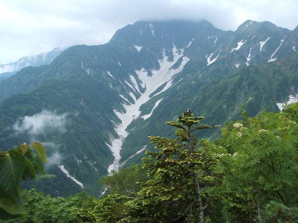 <中央に白く縦に帯状に見えるものがカクネ里雪渓。中遠見山付近(北東側)から望む。鹿島槍ヶ岳の山頂部は雲に隠れている。>