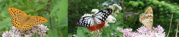 <どのチョウも同じ種類の花にとまっています。左:ミドリヒョウモン、中:アサギマダラ、右:ヒメキマダラヒカゲ。>