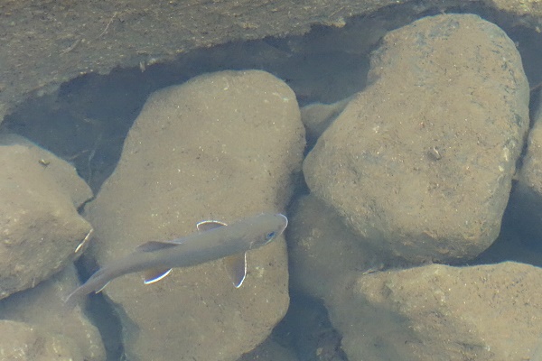 <探していたのは「イワナ」。ヒレに白いラインが入っているのがイワナの仲間の特徴です。上の写真のようにたくさんの人が観察していても全く逃げません。ここは禁漁区。釣られないことを知っているのでしょうか。>