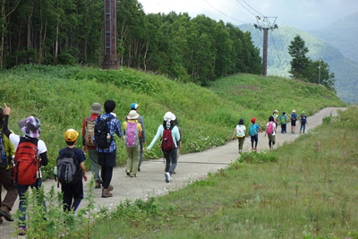 これで「水」に関係するものの観察は終わり、後は麓へ下りるだけです。冬にはスキー場となる斜面に付けられた管理用道路を歩いて下ります。