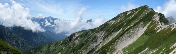稜線に着いたところ、富山県側はガスが切れていて素晴らしい景色を見ることが出来ました。