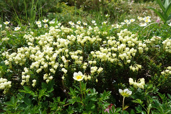 <中央にアオノツガザクラ、手前や奥にチングルマ。>