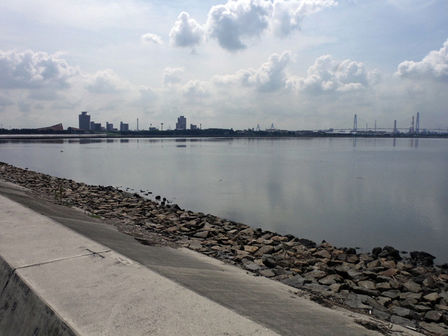 頭の上には広い空、遠くまで見える干潟越しに浮かぶ名港トリトン、