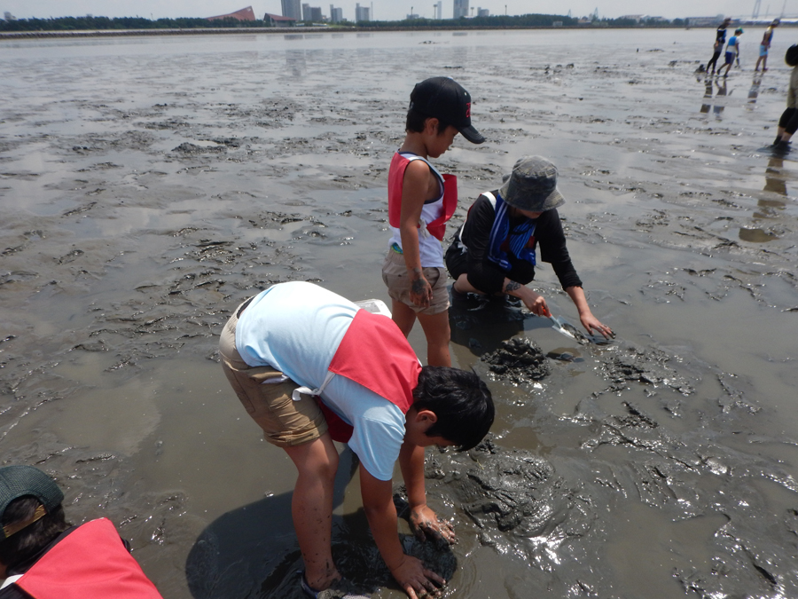 と思いきや、一緒に入ってもらっている保護者の方達も干潟の泥に触れたことを