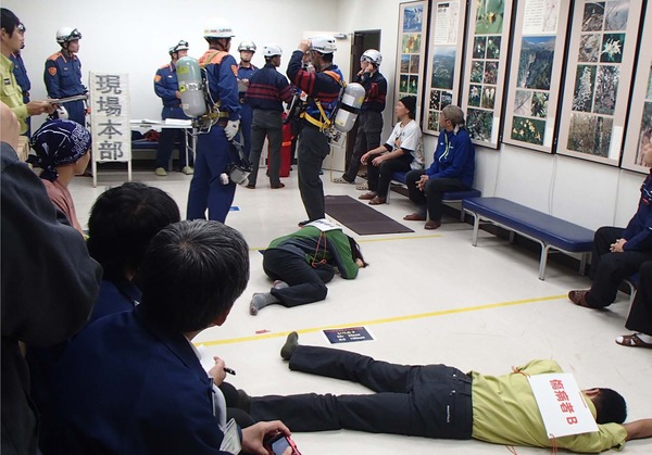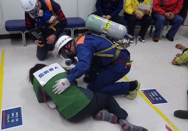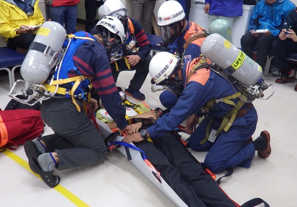救助活動に使う機材や、防毒マスクの装着方法などの確認も行いました。