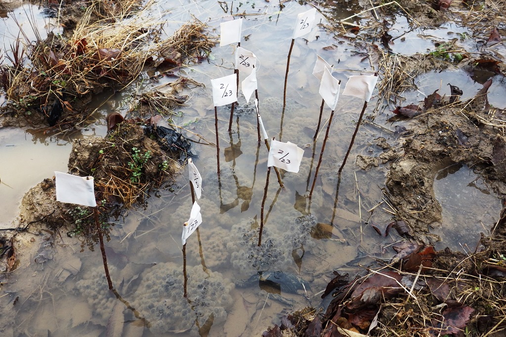 アカガエルの産卵がピークを迎えようとしています。