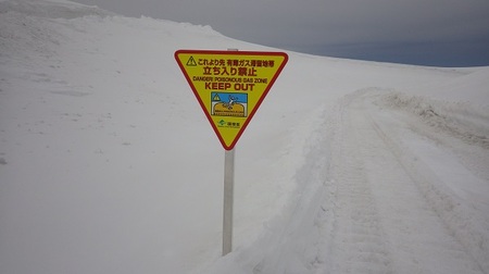 周辺でも天候や風向きによっては火山ガス濃度が高くなり、中毒の危険性が高くなるため、水に濡らしたタオルで口を覆う等の対策を行って速やかに通行してください。