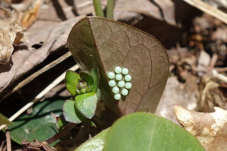 <写真中央のエメラルド色の丸いものがギフチョウの卵で、11個あります。卵の直径は1mm程度です。卵が産みつけられている葉はミヤマアオイという植物の葉です。卵からふ化した幼虫はこの葉を食べます。>