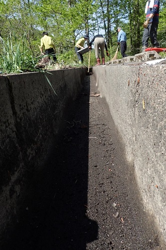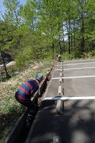 しかし、白山を愛するパークボランティアの皆さんはすごい勢いで落ち葉をかき出していき、あっという間にきれいになってしまいました!  (きれいになった側溝。5月21日撮影)