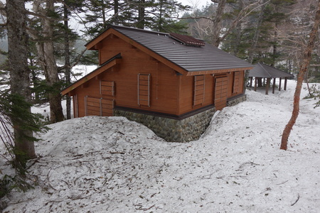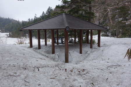 <四十八池湿原の脇にある休憩所。ここも約1mの積雪。柱の周りから雪が溶け始めているのが面白い。>