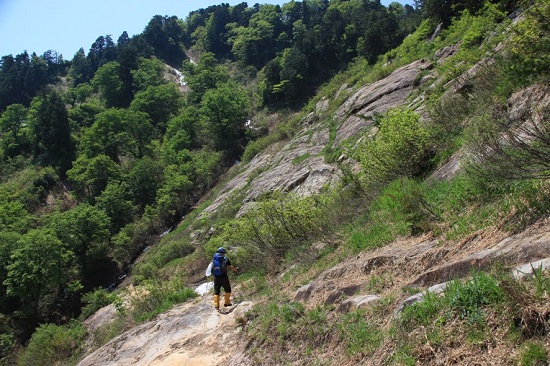 (陽光を浴びたムラサキヤシオツツジに目を奪われました!5月30日撮影) 次はビッグスケールの岩壁! 登山口から50分ほど進んで峠を越えると、新緑の美しい谷に突如巨大な岩壁が現れます。鎧壁と呼ばれていて砂岩やれき岩の地層を観察することができます。