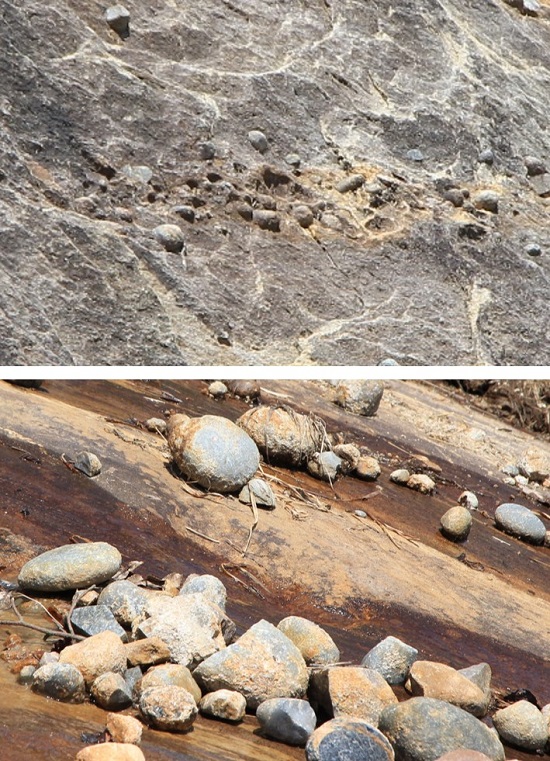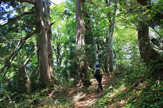 (鎧岩。大きすぎて全体が写真に収まりません・・・。5月30日撮影) よく見ると岩壁には丸い石が含まれているのがわかります。  (上:岩壁に含まれる丸い石 下:岩壁周辺に落ちている石) 白峰ではこの石を「茶碗石」と呼んでいたそうです。昔は陶器の原料石を砕くための石として使われており、買い付けにくる人がいたそうです。 さらに天然スギの巨木にも出会うことができます! この辺りは嵐谷天然スギ植物群落保護林となっており、天然スギの巨木が迎えてくれるんです♪  (天然スギの間を進む気持ちのよい登山道。5月30日撮影)