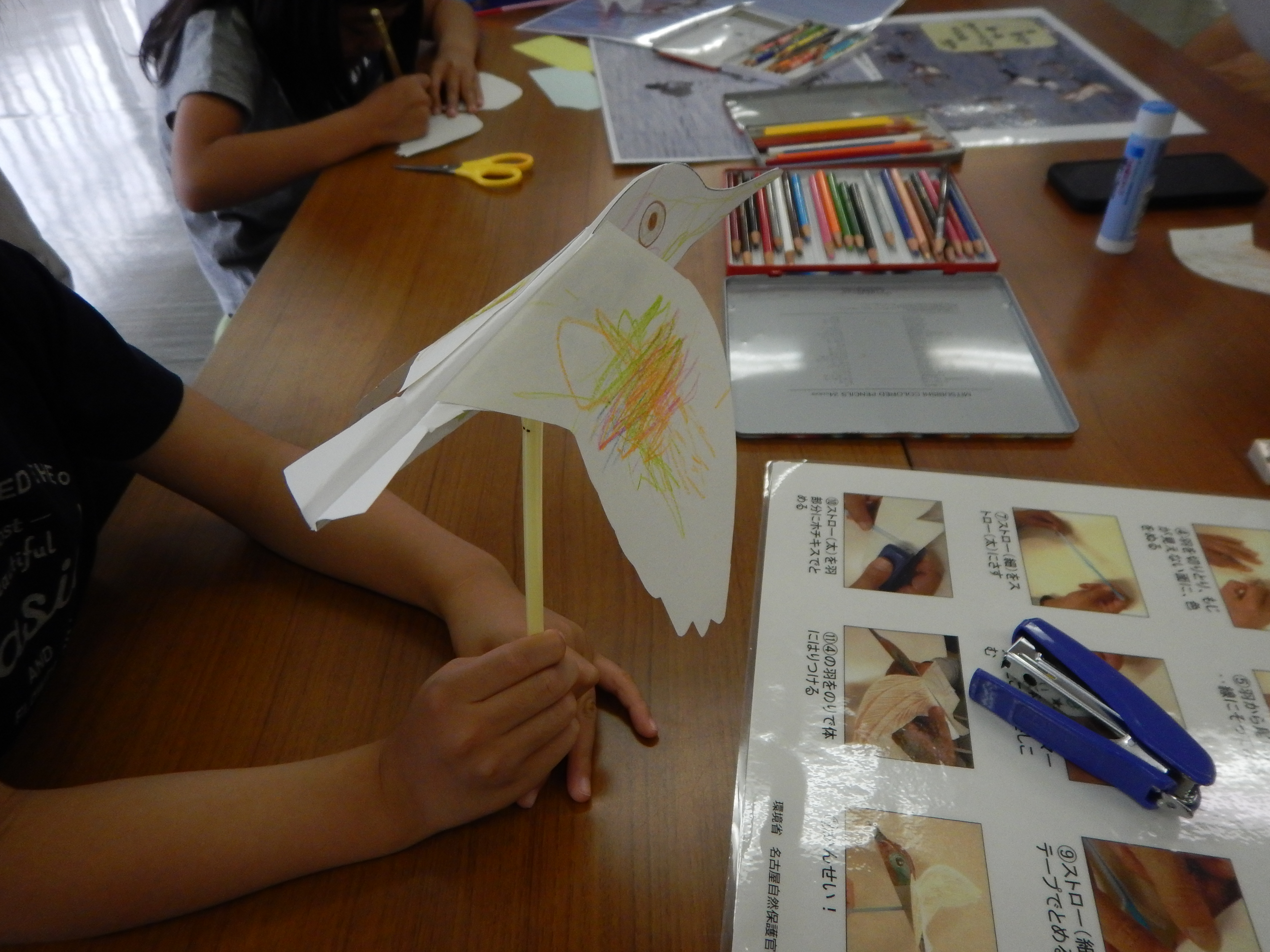 この日はレンジャーが来る日として、レンジャーへの質問に回答したり、また子どもたち対象にパタパタ鳥を作るワークショップを行いました。