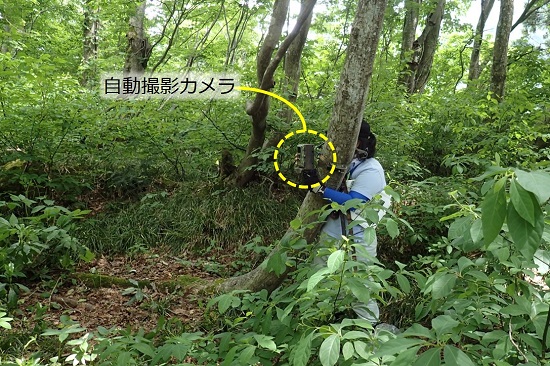 (ニホンカモシカ) 今、ニホンジカ(一枚目の写真)は全国的に増加しています。 黒くて大きな瞳が魅力的なかわいらしい動物ですが、侮ってはいけません。 ニホンジカは食欲旺盛なうえ、群れで行動し、気に入った場所には長くとどまるという習性があります。このため、居ついてしまうとその場所の植物がごっそりなくなってしまうことがあります。 増えすぎたニホンジカによって樹皮が剥がされて木々が枯れたり、高山帯のお花畑の高山植物が食べ尽くされたり、生態系のバランスが崩れてしまうような困ったことが起きている地域もあります。 白山では深刻な影響はまだ確認されていませんが、周辺の地域ではニホンジカが増加し、白山の標高の高いところでもニホンジカが目撃されるなど、心配なところがあります。 このため、環境省では白山のニホンジカ生息状況を平成25年から毎年継続して調査しており、先日もニホンジカの生息状況調査用の自動撮影カメラ設置作業が行われました。  (自動撮影カメラ設置の様子。6月20日撮影) ここは白山国立公園の福井県側にある場所ですが、カメラ周辺ではニホンジカのものと思われるフンや食痕などが複数確認されました。 ニホンジカの進出が心配される白山国立公園では、地域の皆さんや来訪者の皆さんからも目撃情報を募集しています。 ビジターセンター等でチラシを配布していますので、ご協力いただければ幸いです。  (配布しているチラシ。クリックすると大きな画像が見られます。)