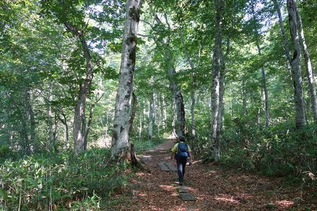 この湿原は北ドブ湿原という名前で、カヤの平高原総合案内所という中心的な施設(駐車スペースあり)から約45分歩きます。そこまで歩く途中のブナ林も見事です。
