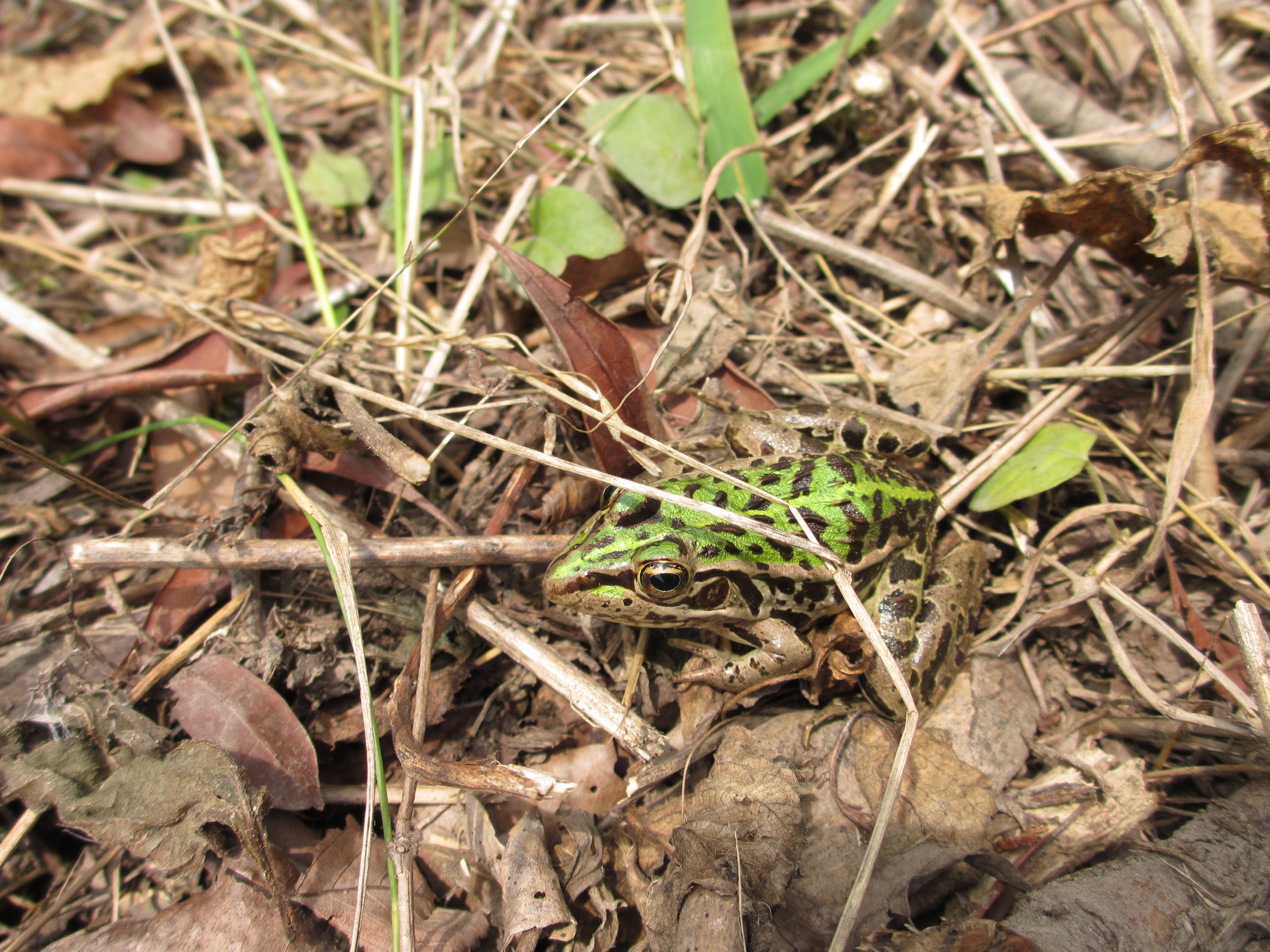 池に降りるとまず現れたのがツチガエル。藻の上に乗って顔を出しています。