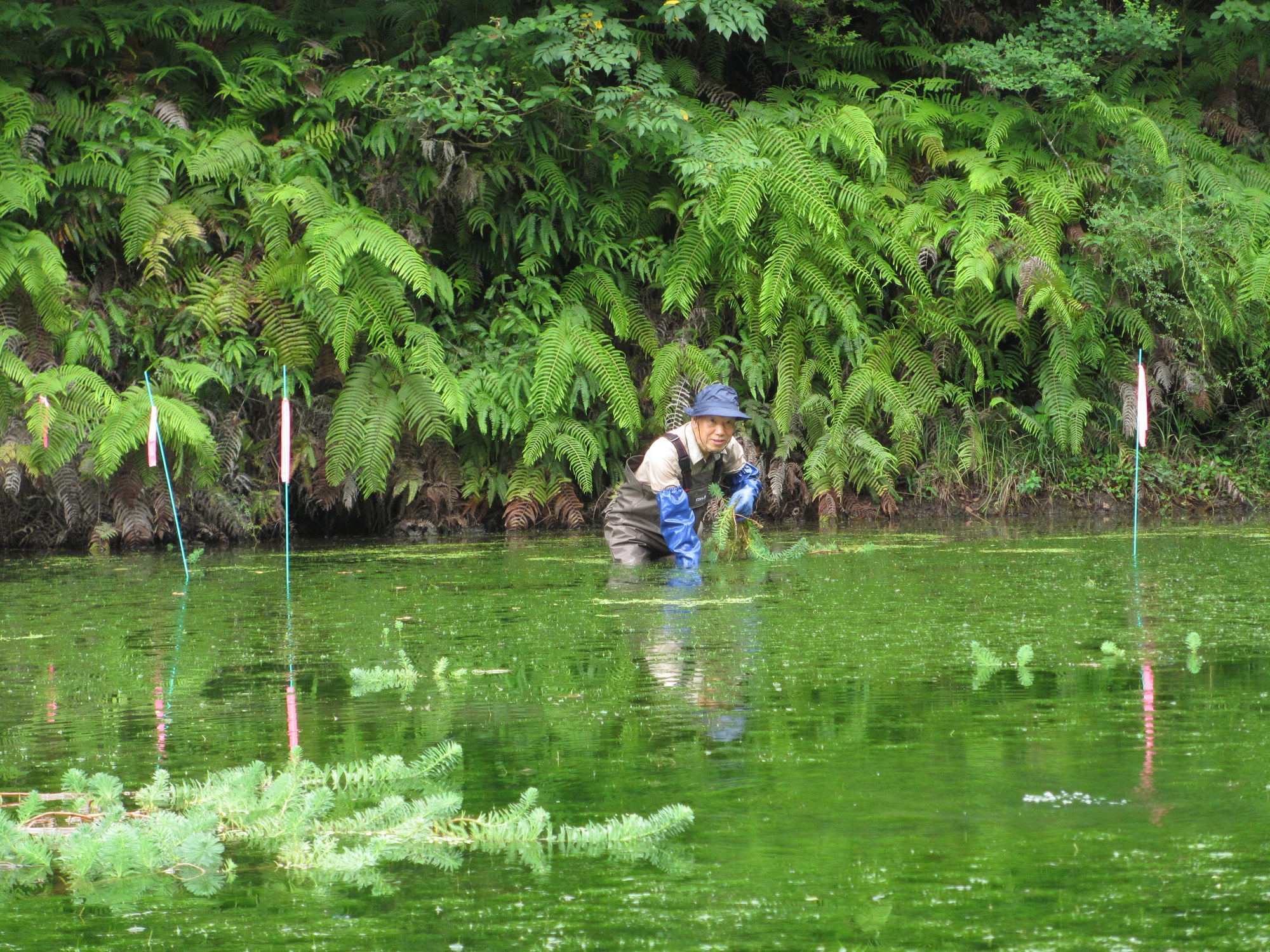 この池では環境省の特定外来種にも指定されている「オオフサモ」が増殖し、もともと近隣に生息している在来の藻などの生育を阻んできました。