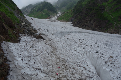 ・大雪渓下部で雪渓に割れ目ができているところがあります。紅ガラ(染料)に従って通行してください。